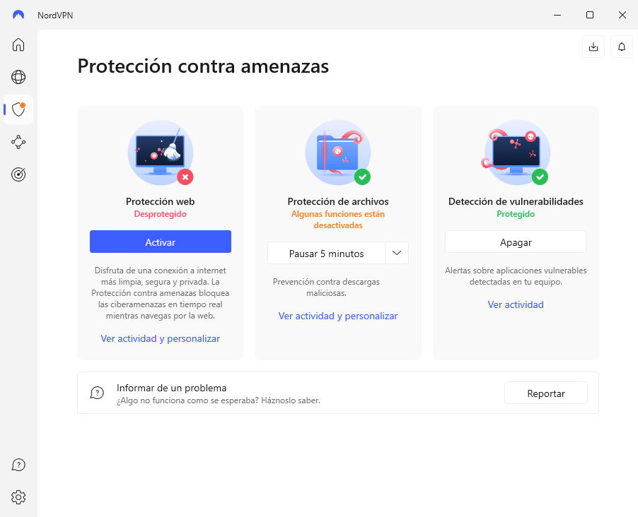 Protección frente a amenazas puede funcionar sin estar conectado a la VPN. Para utilizar la versión Lite, primero debe conectarse a un servidor NordVPN. Tenga en cuenta que esto puede cambiar con futuras actualizaciones.